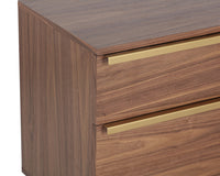 Bring style and warmth to living or dining space with this mid-century modern sideboard. Crafted with walnut wood veneer and powder coated gold steel hardware. Two drawers and two cabinets provide ample storage.