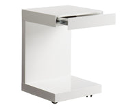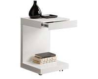 This simple but very functional c-shaped table with drawer can be used with a sofa, chair or even as a nightstand. Stocked in high gloss white. Available in white or espresso. Castors are included.