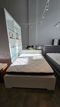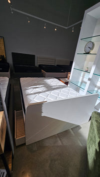 The Double Storage Bed Set is a definitive solution for sophisticated, space-conscious living, offering a seamless blend of architectural minimalism and exceptional utility. Characterized by its crisp white finish and clean-lined silhouette, the bed frame serves as a versatile foundation that brightens and expands the visual feel of any master suite or guest room. This piece is thoughtfully engineered with an integrated, high-capacity storage drawer featuring a refined striped interior, providing a discreet sanctuary for linens and essentials while maintaining a clutter-free aesthetic.