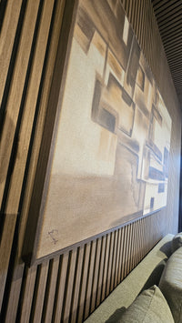 The Iberis Canvas Painting is a compelling study in light, shadow, and architectural form, masterfully hand-painted by artist Ksenia Sizaya. This large-scale abstract work is characterized by its sophisticated interplay of translucent layers and rich, tactile textures that evoke a sense of collage-like depth. Executed on premium linen canvas, the palette of warm browns and earthy tones provides a grounded yet luminous presence, making it a definitive focal point for a curated living room, executive office, or master suite.