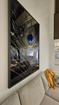 The Lost Feather is a definitive statement piece from the Luxe Art collection, designed to anchor a room with dramatic scale and iridescent beauty. This large-format artwork captures the intricate, mesmerizing detail of a peacock feather in a palette of deep blues, vibrant greens, and luminous silver tones. The composition’s grand proportions and shimmering textures create an immediate sense of grandeur, making it an ideal focal point for an executive office, a formal dining room, or a high-end living space.