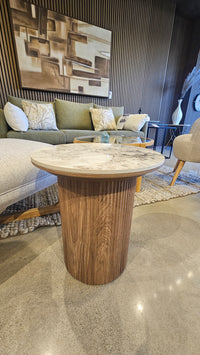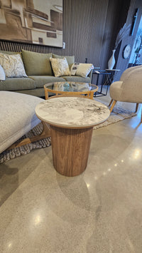 Roman Side Table – Calacatta Gold Ceramic Top with Light Walnut Base (Floor Model)