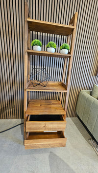 Key Design Features: Modular tall-profile silhouette featuring four open display galleries and integrated dual storage drawers.
