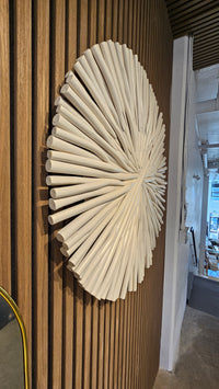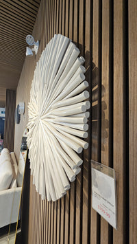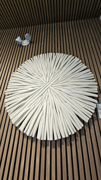 The Sumatra Teak Wood Wall Décor is a masterclass in organic geometry, offering a sophisticated architectural presence that anchors any high-end interior. Meticulously hand-assembled from individual teak wood elements, the piece features a mesmerizing sunburst pattern that radiates from a central axis, creating a dynamic sense of movement and visual rhythm. The soft white finish enhances the natural grain and intricate textures of the teak, allowing the sculpture to interact beautifully with ambient light while maintaining a serene, minimalist aesthetic.