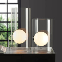 Soft light floats in a glowing orb in this unique glass cylinder lamp.