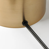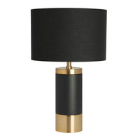 Construct a timeless, elevated ambiance with this sleek combination of brass and black cement, complete with a chic fabric shade.