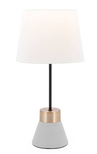 A modern mix of brass and cement make this the ideal lamp for any space. Fabric shade.