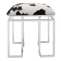 This modern stool combines unfinished cow hide on a slick stainless steel frame, for a cool designer style. Perfect as an accent or at a vanity or make-up table.