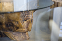 Made from upcycled Indonesian Teak root, these tables are finished with a unique timeworn look. These live edge tables are one-of-a-kind and sure to get customers talking. Authentically carved by nature, sturdy, durable, and made of solid wood and tempered glass, each piece passes as a work of art.