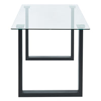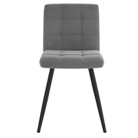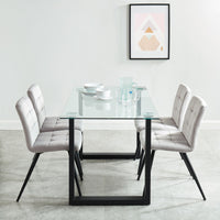 The clean-line design and clear tempered glass gives this table a modern, minimalist look that's punctuated with the sleek black frame. Minimal assembly is required. Cute and contemporary, these velvet-upholstered dining chairs will elevate the style factor in your space. Smaller scaled chairs are great for tighter spaces, but the tufted cushions on the back and seat means there is no sacrificing on comfort.