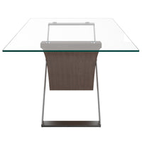 This fun, contemporary table will bring a wave of excitement into your home. The walnut-finished and stainless steel base come together to create a visually inspiring table that is as much a piece of art as a functional dining table. The glass table top keeps a nice open, airy feel to the piece and the chrome accents add a little sparkle. Mix and match with a variety of chair styles and finishes to create the perfect look for your space.