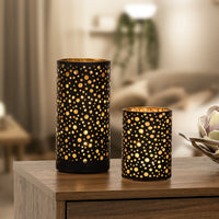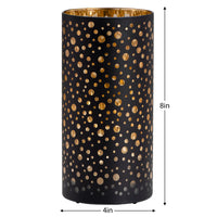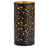 Accent your home with inviting sophistication with this black glass LED hurricane lamp. Elegantly adorned with a silhouette dot design, soft micro LED lights within create a warm glow that reflects on the outside through the gold tone. Add a touch of timeless design to a shelf or side table for inviting illumination.