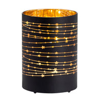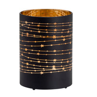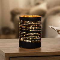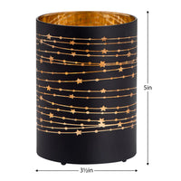 Bring a touch of sophistication and inviting warmth to your home decor with this beautiful Silhouette Star Design Black Glass 3.5x5" LED Hurricane Lamp. The luxurious design features high-quality black glass and a golden star silhouette to bring out the alluring glow of the micro LED lights shining within. Perfect for adding a cozy and inviting atmosphere to any shelf or table.