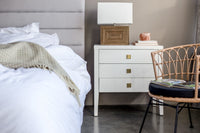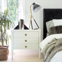 Our classic Hara collection is designed in solid rubberwood and beech veneer with a white finish and brushed gold hardware pulls. This 3-drawer dresser is the perfect companion piece in the bedroom or the living room.