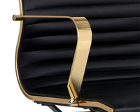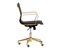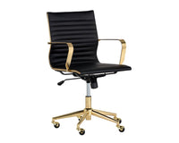 This office chair from our Urban Unity collection offers glamorous femininity. Features horizontal channel tufting on the seatback with a stunning polished gold steel frame and castors for mobility. Stocked in black faux leather.