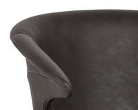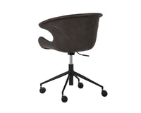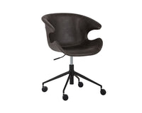 This swivel office chair features an intriguing retro design to offer style and comfort to any office space. Stocked in hearthstone brown, nightfall black and town grey faux leather with black powder coated iron legs. Castors allow for easy mobility.