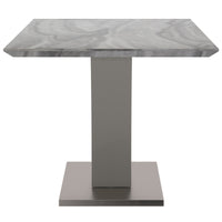 Embrace the classic look of marble and make it modern with this fun dining table. All the finishings - from the marble-look paper veneer to the stainless steel wrap on the base - give this piece a high end look without breaking your budget. The fun, geometric base provides plenty of visual interest and the warm grey finish allows for any easy mix with any colour scheme. Choose the chair that works for you and make the space your own.