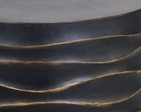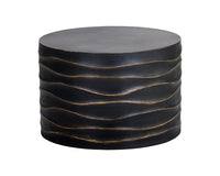 This round coffee table will create a moody environment. Crafted from concrete, this piece features hand sculpted ridges with a painted brass and gold finish. The perfect addition to living, lounge and office spaces. Can be paired with matching side table. Suitable for indoor and covered outdoor spaces.