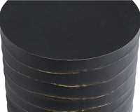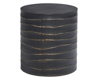 This round side table will create a moody environment. Crafted from concrete, this piece features hand sculpted ridges with a painted brass and gold finish. The perfect addition to living, lounge and office spaces. Can be paired with matching coffee table. Suitable for indoor and covered outdoor spaces.