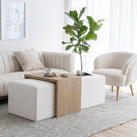 Need an ottoman, bench and coffee table in one? Short on space? Just love gorgeous design? Our Forrest Coffee Ottoman is for all of you.This minimalist ottoman and coffee table combo has hints of Art Deco design and re-imagined with modern styling. Upholstered in a gorgeous cream fabric, this rectangular ottoman comes with a natural blonde oak waterfall table that slides of the top. Versatile and designed with contemporary appeal, this flexible piece can be used as extra seating, a coffee table or even at the end of a bed.
