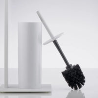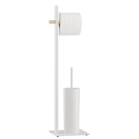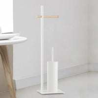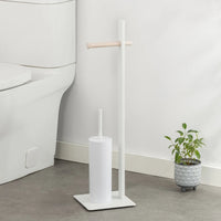 With a fresh modern look, this freestanding toilet paper stand is a beautiful complement to your bathroom decor. The powder coated white metal stand features a rubberwood accent and holds 1 roll of tissue at the top, and a cleaning brush below. The space-saving, yet elegant design of the slim profile and sturdy platform fits in nicely in small spaces where storage is limited. An ideal piece for any modern home, this stylish stand is sure to make an understated impression.