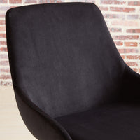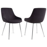 This dining table features a sleek black 8mm tempered glass tabletop for wipe-clean durability along with effortless style. The sloped back of this mid-century modern style chair adds a level of sophistication and a dash of excitement to any room. Upholstered in a luxurious velvet, the chrome-finished legs of this piece further enhance its overall allure while the sturdy frame ensures comfortable seating for guests.