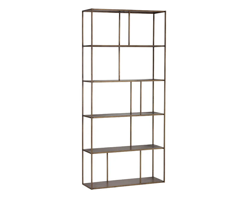 Add style and warmth to living and office spaces with this well-designed iron bookcase in a brushed antique brass finish. Can be placed in pairs or multiples for added impact and functionality. Also available in a smaller size. Anti-tipping kit included.