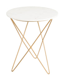 The Earth Wind Fire Marble Pedestal Side Table is a contemporary piece that features a marble top with a gold metal finish.