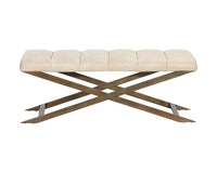 An elegant bench designed with modern warmth. Designed with channel tufting and an antique brass x-base. Available in polo club kohl grey or muslin performance fabric and bravo cream or metal faux leather. Performance fabric is moisture repellent, stain resistant and easy to clean.