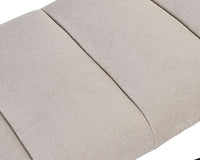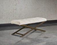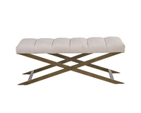 An elegant bench designed with modern warmth. Designed with channel tufting and an antique brass x-base. Available in polo club kohl grey or muslin performance fabric and bravo cream or metal faux leather. Performance fabric is moisture repellent, stain resistant and easy to clean.
