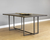 This uniquely crafted dining table will add transitional allure to any dining space. The table features a stunning ash grey acacia wood veneer tabletop with antique brass steel detailing down the center, and matching base. Suitable for residential and contract settings.