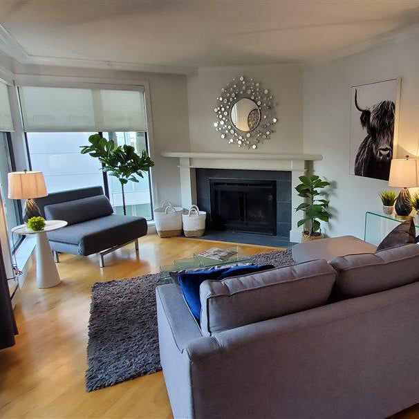 A masterclass in maximizing urban spaces. This Fairview home staging project features a contemporary corner fireplace as the focal point, accented by a striking sunburst mirror and eclectic art pieces. The mix of plush textures, organic greenery, and modern seating creates a warm, inviting atmosphere that perfectly balances West Coast charm with sophisticated city living.
