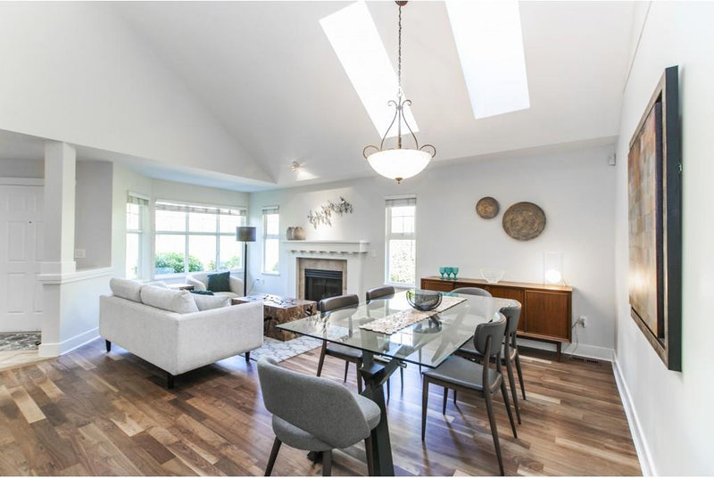 Discover an extraordinary living experience in the prestigious Rosemary Heights neighborhood. This masterfully staged home features dramatic vaulted ceilings and dual skylights that bathe the open-concept dining and living areas in natural light. We’ve anchored the space with a sophisticated glass-top dining table and mid-century modern sideboard, complemented by a cozy fireside seating arrangement. The rich walnut-toned flooring and contemporary art pieces create a harmonious balance of luxury and warmth, perfect for showcasing the upscale Surrey lifestyle.