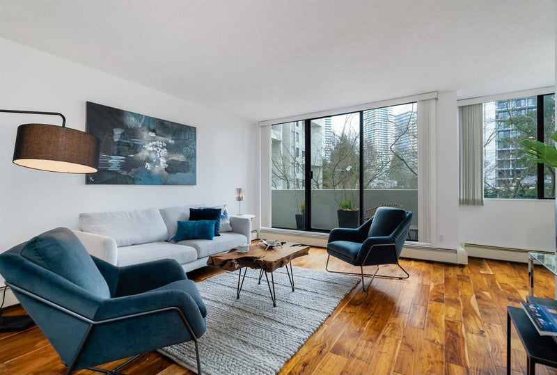 Experience contemporary sophistication in the heart of Metrotown. This professional staging project by Briers showcases a bright, expansive living area where bold color meets organic texture. We’ve anchored the room with a plush grey sofa and two striking velvet accent chairs in deep teal, creating a perfect balance of comfort and style. The stunning live-edge wood coffee table and textured area rug complement the warm hardwood floors, while the floor-to-ceiling windows highlight the home's connection to the vibrant Burnaby skyline.