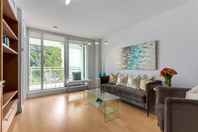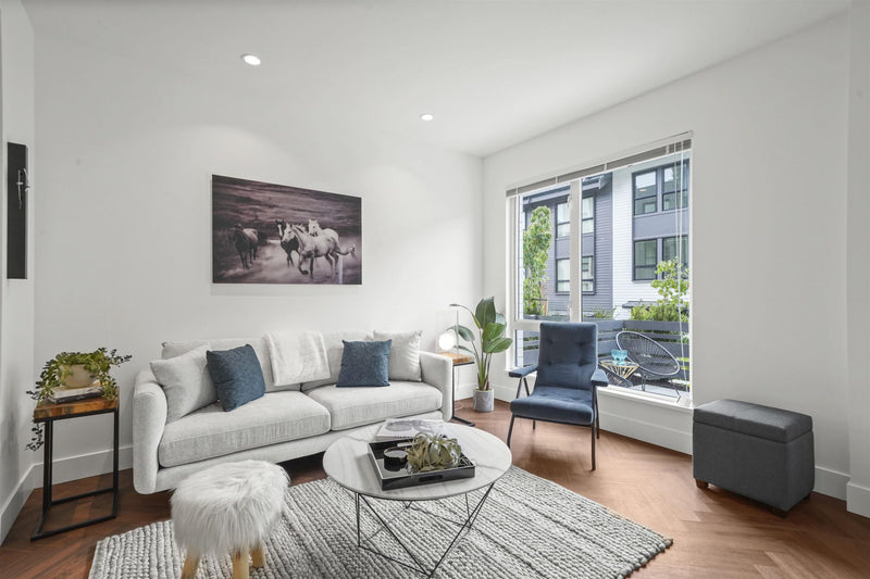 Discover a masterfully staged urban retreat in the vibrant Lower Lonsdale area. This garden-level residence features a spacious open-concept living area, anchored by a deep charcoal sectional sofa and sleek minimalist furniture. The design emphasizes a seamless transition to the private outdoor terrace, while the light hardwood floors and crisp white cabinetry enhance the natural brightness of the home. Every detail, from the glass accents to the curated landscape-inspired art, is selected to showcase a contemporary and serene lifestyle in one of North Vancouver's most sought-after neighborhoods.
