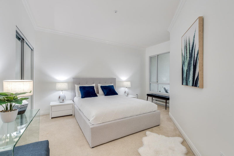Situated in the prestigious Beach Crescent neighborhood, this staging project defines contemporary Yaletown elegance. We’ve transformed this open-concept living space with a statement charcoal velvet sofa, gold-leaf abstract art, and a minimalist glass dining set. The contrast between the warm wood kitchen cabinetry and the cool, sophisticated textures of the furniture creates a high-end atmosphere that perfectly complements the waterfront lifestyle of False Creek North.