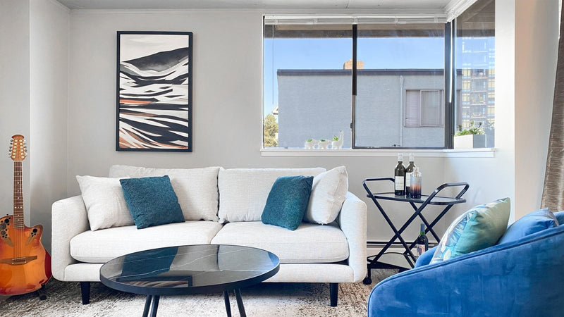 Discover a stylishly curated living space in the heart of historic New Westminster. This professional staging project by Briers highlights a modern open-concept layout, featuring a crisp white sofa contrasted with deep teal accents and a luxurious blue velvet armchair. The inclusion of a minimalist bar cart and natural wood elements creates an inviting, "move-in ready" atmosphere. With plenty of natural light and contemporary abstract art, this home perfectly balances functional urban living with sophisticated, artistic flair.