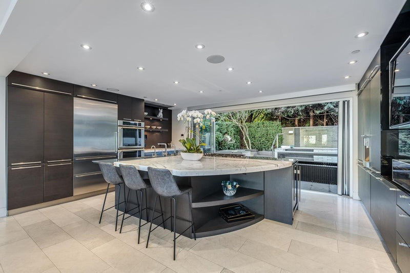 A pinnacle of West Side luxury located in the prestigious Point Grey neighborhood. This bespoke staging project showcases a state-of-the-art kitchen designed for the ultimate entertainer. Featuring a massive, custom-curved marble island and professional-grade integrated appliances, the space is defined by its seamless indoor-outdoor flow through floor-to-ceiling folding glass walls. The dark cabinetry provides a sophisticated contrast to the light stone flooring, creating a bold, contemporary atmosphere that highlights the home’s grand scale and architectural brilliance.