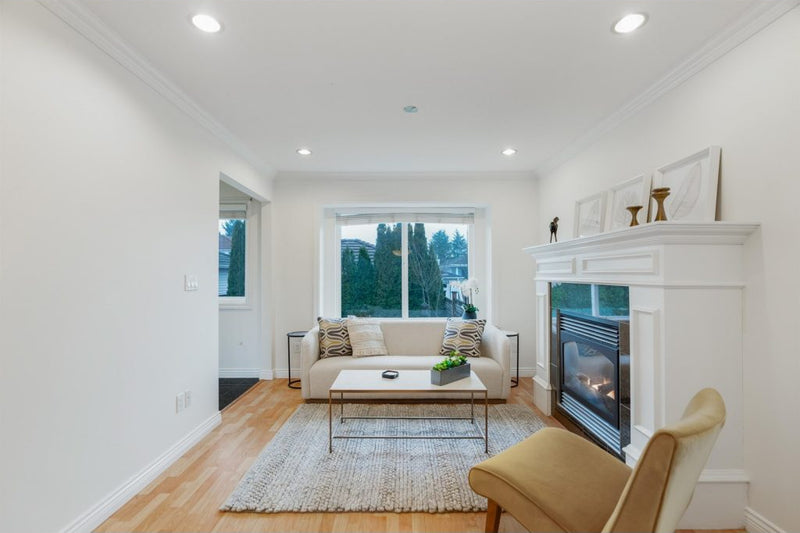 Discover a masterfully utilized living space in the heart of the Central Burnaby neighborhood. This staging project by Briers highlights a bright, welcoming atmosphere anchored by a classic white mantle fireplace. We’ve selected a streamlined cream sofa and a mid-century inspired accent chair in warm ochre to maximize seating without crowding the room. The use of a textured natural fiber rug and minimalist coffee table enhances the home’s clean lines and light hardwood floors, creating a sophisticated yet comfortable sanctuary perfect for modern family living.