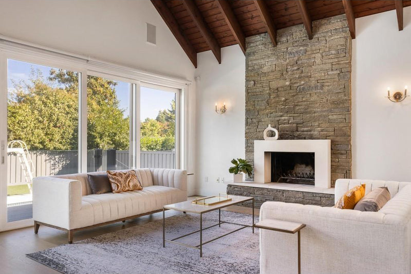 Discover a masterclass in organic modernism in the prestigious Southlands area. This stunning staging project highlights a magnificent floor-to-ceiling stone fireplace set against soaring vaulted wood-beam ceilings. We’ve balanced the rugged textures with sophisticated, cream-tufted sofas and minimalist marble accents. The expansive windows invite the lush greenery of Vancouver’s West Side indoors, creating a serene, high-end sanctuary that perfectly blends timeless architecture with contemporary comfort.