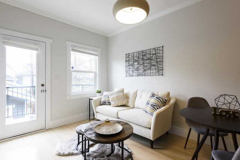 Located in the heart of the trendy Mount Pleasant East neighborhood, this staging project showcases the perfect blend of cozy comfort and contemporary flair. We’ve optimized this bright living area with a streamlined cream loveseat, dark wood nesting tables, and mid-century inspired dining furniture to create a multi-functional space without compromising on style. The neutral palette, accented by geometric wall art and organic textures, highlights the home's natural light and beautiful hardwood floors, offering a chic and inviting sanctuary for the modern urbanite.