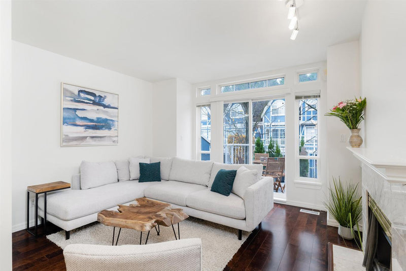 Discover a bright and masterfully styled townhouse in the heart of Richmond. This staging project by Briers emphasizes a clean, contemporary aesthetic with an organic twist. Featuring a spacious light-grey sectional, the room is anchored by a stunning live-edge wood coffee table that adds warmth and character. The open-concept layout is bathed in natural light from the expansive windows, seamlessly connecting the interior with the private patio. Every detail, from the marble fireplace to the botanical accents, is curated to create a sophisticated yet inviting home for the modern family.