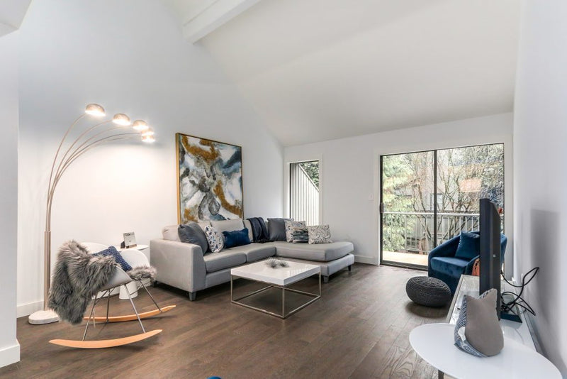 Discover contemporary urban living in the sought-after Burnaby Mountain area. This professional staging project by Briers showcases a refined living space where textures take center stage. From the plush grey sofa and navy velvet accents to the marble-topped coffee table and textured area rug, every element is curated to create a harmonious and inviting atmosphere. The design emphasizes the stunning herringbone wood floors and large windows, seamlessly connecting the chic interior with the private patio views.