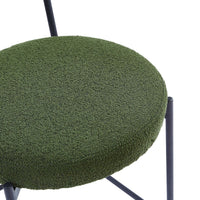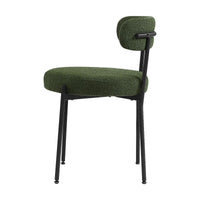 Relax in elegance with the Molly Dining Chair. Crafted from durable black powder coated metal and sumptuously upholstered in luxurious green boucle fabric, this chair will bring a touch of sophistication to your dining space. Curved edges and plush foam padding make for a comfortable dining experience and complete the look of refinement.