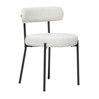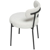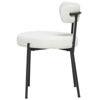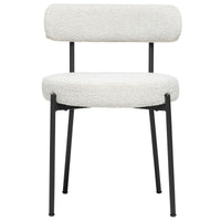 Relax in elegance with the Molly Dining Chair. Crafted from durable black powder coated metal and sumptuously upholstered in luxurious white boucle fabric, this chair will bring a touch of sophistication to your dining space. Curved edges and plush foam padding make for a comfortable dining experience and complete the look of refinement.