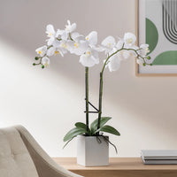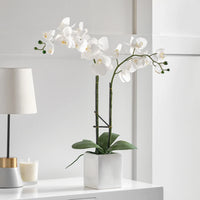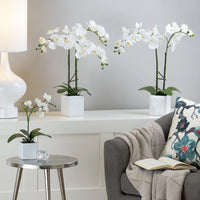 Our 23” Double Stem White Orchid Potted Faux Set exudes an air of sophistication with its lifelike craftsmanship and bright white ceramic pot. Add a touch of class to your home decor with this carefully constructed faux orchid—an exquisite choice for both bedrooms and living rooms, and the office too. Enjoy lush beauty without the maintenance, and bask in the glory of this tasteful blooming flower.